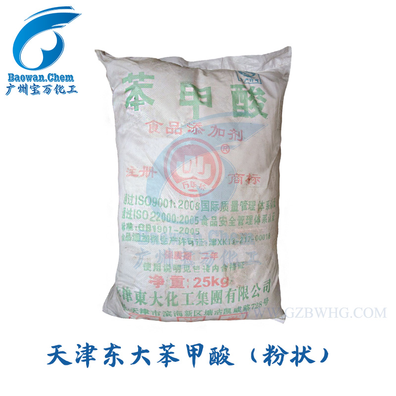 苯甲酸可以用作食品、飼料、乳膠、牙膏的防腐劑。在酸性條件下,對霉菌、酵母和細菌均有抑制作用,但對產(chǎn)酸菌作用較弱。苯甲酸分子態(tài)的抑菌活性較離子態(tài)高,故PH小于4時,抑菌活性高,抑菌的最適pH值為2.5~4.0,一般以低于pH值4.5~5.0為宜。由于苯甲酸對水的溶解度低,故實際多是加適量的碳酸鈉或碳酸氫鈉,用90℃以上熱水溶解,使其轉(zhuǎn)化成苯甲酸鈉鈉后才添加到食品中。若必須使用苯甲酸,可先用適量乙醇溶解后再應(yīng)用。由于苯甲酸對水的溶解度比苯甲酸鈉低,因此在酸性食品中使用苯甲酸鈉時,要注意防止由于苯甲酸鈉轉(zhuǎn)變成苯甲酸而造成沉淀和降低其使用效果。苯甲酸在醬油、清涼飲料中可與對-羥基苯甲酸酯類一起使用而增效。定香劑